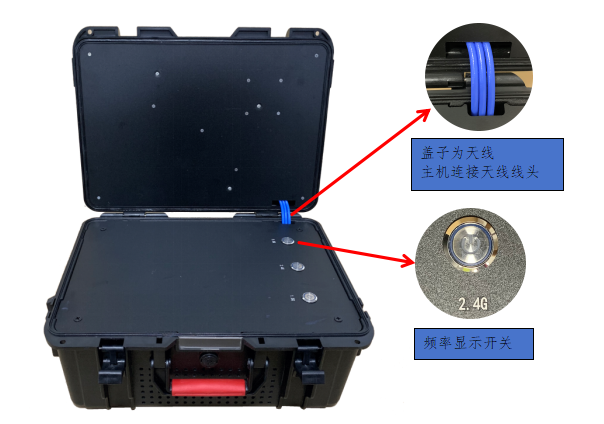 1、干擾遙控、圖傳信號,同時打開2.4G、5.8G開關(guān);開始發(fā)射信號,天線面向無人機(jī)。
