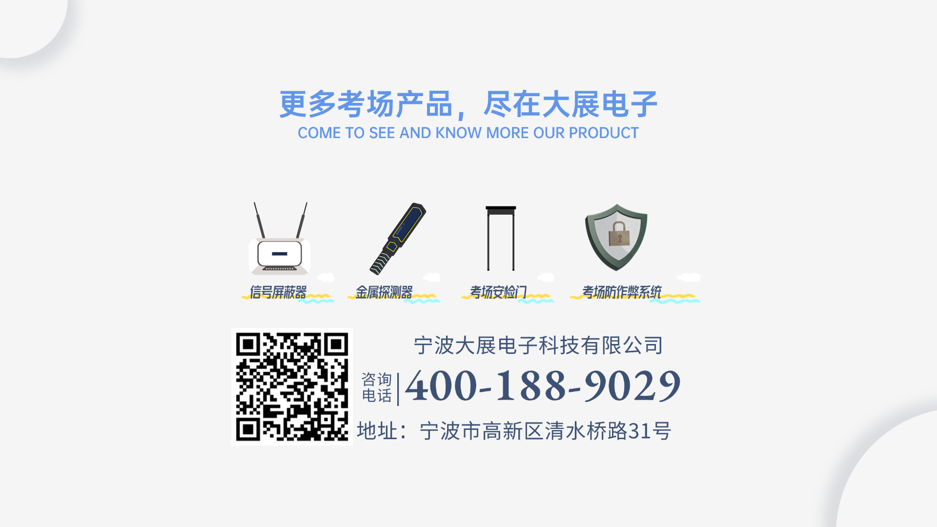 憑借卓越的產(chǎn)品性能、可靠的質(zhì)量和完善的售后服務(wù),寧波大展電子科技有限公司的產(chǎn)品不僅在國(guó)內(nèi)市場(chǎng)廣泛應(yīng)用,覆蓋了眾多考試機(jī)構(gòu)、學(xué)校、企事業(yè)單位等,還遠(yuǎn)銷(xiāo)海外多個(gè)國(guó)家和地區(qū),贏得了全球客戶的信賴(lài)與好評(píng)。公司始終秉持創(chuàng)新、責(zé)任、共贏的理念,不斷提升技術(shù)水平,完善產(chǎn)品和服務(wù),致力于為客戶提供更優(yōu)質(zhì)、更高效的信號(hào)屏蔽解決方案,為維護(hù)考試公平、信息安全等貢獻(xiàn)自己的力量 。